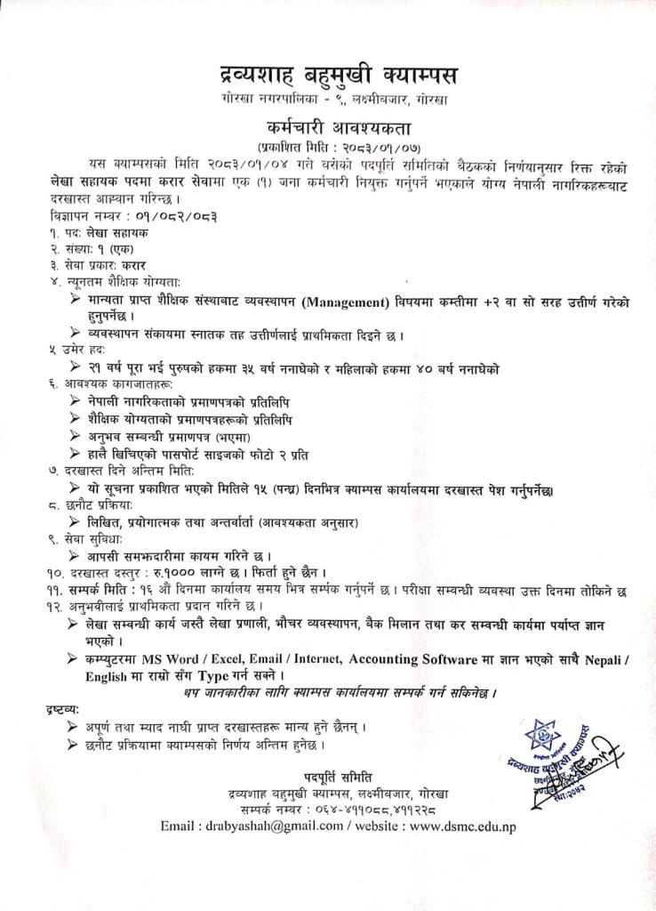 Drabya Shah Multiple Campus (DMC) was established in 1985 AD under the affiliation of Tribhuvan University as a community-based, nonprofit-oriented, non-governmental institution. It is committed to imparting quality higher education in the Gorkha district. The campus is managed by a team of representatives from various sectors of the community and collaborates with Tribhuvan University, the University Grants Commission, provincial and local governments, academic institutions, and various governmental organizations (GOs) and non-governmental organizations (NGOs).
