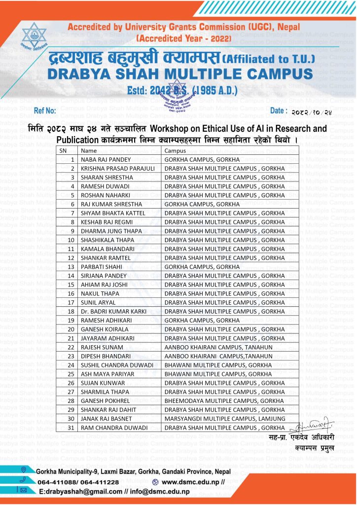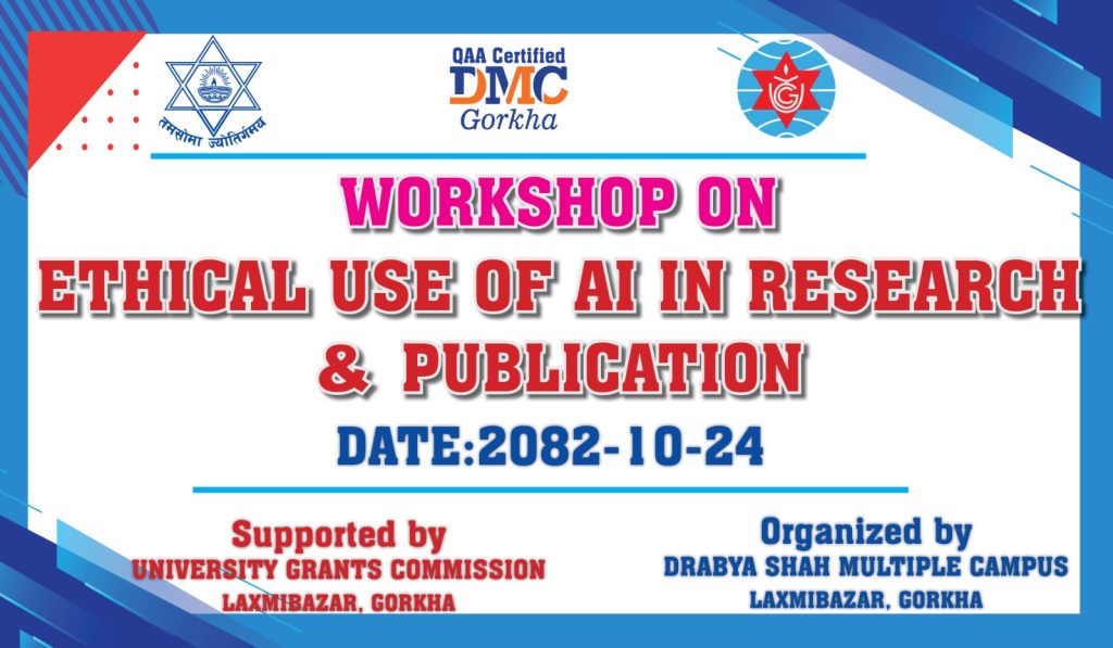 विश्वविद्यालय अनुदान आयोगको आर्थिक सहयोगमा यस द्रव्यशाह ब क्याम्पस लक्ष्मीबजार गोरखाको आयोजनामा Workshop on Ethical Use of AI Research & Publication शुरूभएको छ । वर्कसपमा क्याम्पसका प्राध्यापक एवं कर्मचारीहरू , गोरखा क्याम्पस, भवानी बहुमुखी क्याम्पस, भिमोदय बहुमुखी क्याम्पस, आबुखैरेनी बहुमुखी क्याम्पसका प्राध्यापकहरूको सहभागीता रहेको छ । नीति तथा अनुसन्धान कार्यालयका डा.निरञ्जन देवकोटाज्यूले प्रशिक्षण गर्नुभएको छ